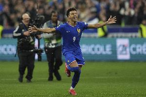 体育资讯3月30日讯 国际足球友谊赛,法国和哥伦比亚交手。本场比赛,杜埃在上半场打进国家队处子球后,下半场上演了梅开二度的好戏。