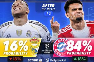 本场赛前,皇马晋级欧冠四强的概率为34%,拜仁为66%;首回合比赛结束后,皇马的晋级概率被下调至16%,拜仁则上升至84%。