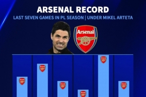 阿尔特塔执教阿森纳赛季最后7轮比赛拿分: